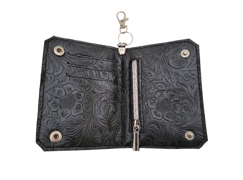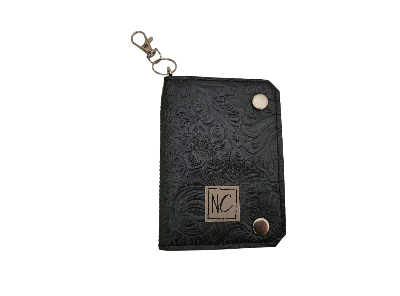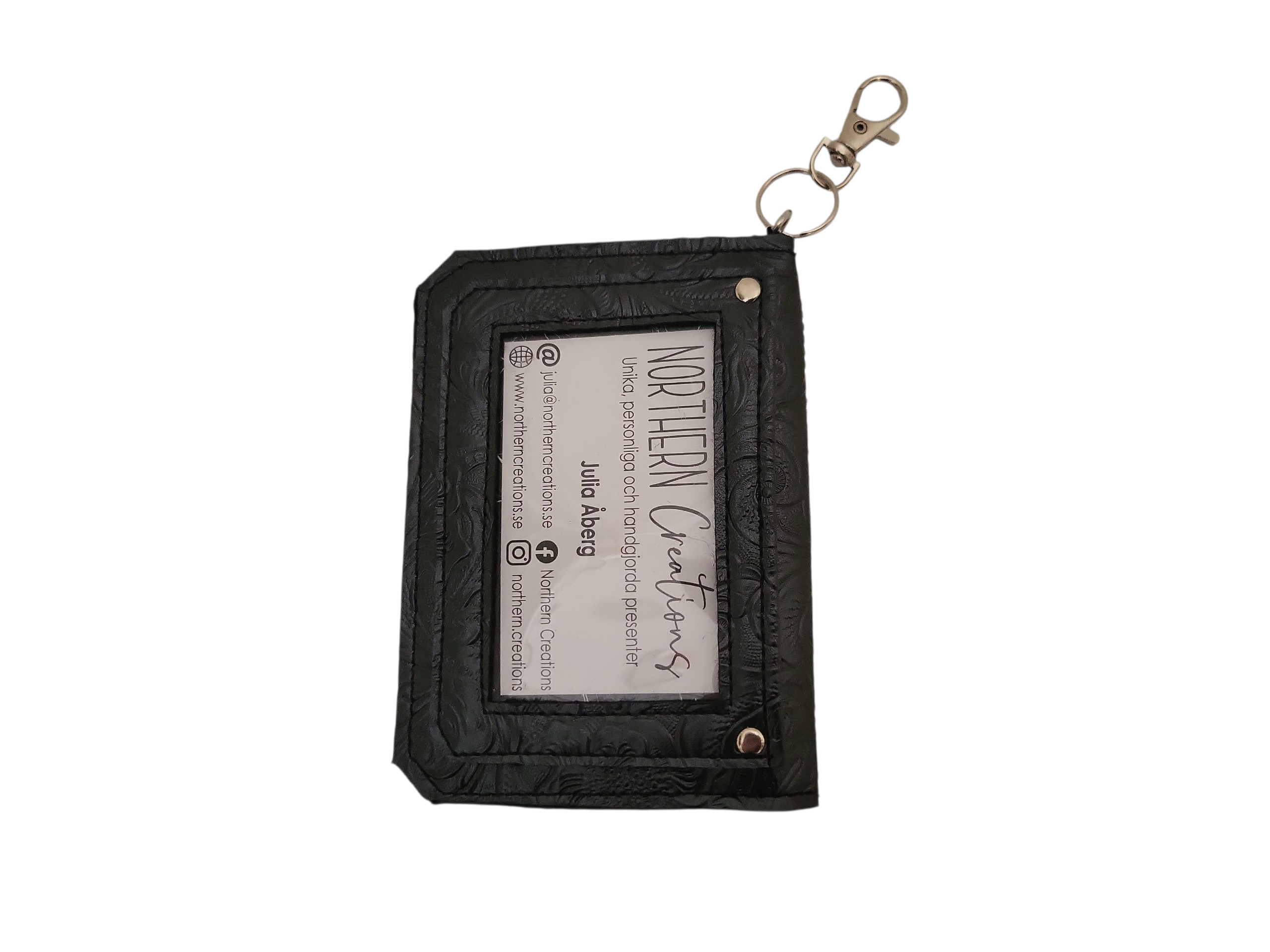 Liten plånbok med karbinhake och fack för mynt/sedlar och kort. Ett blixtlåsförsett fack samt 3 kortfack invändigt. Ett fack för id-kort på utsidan.